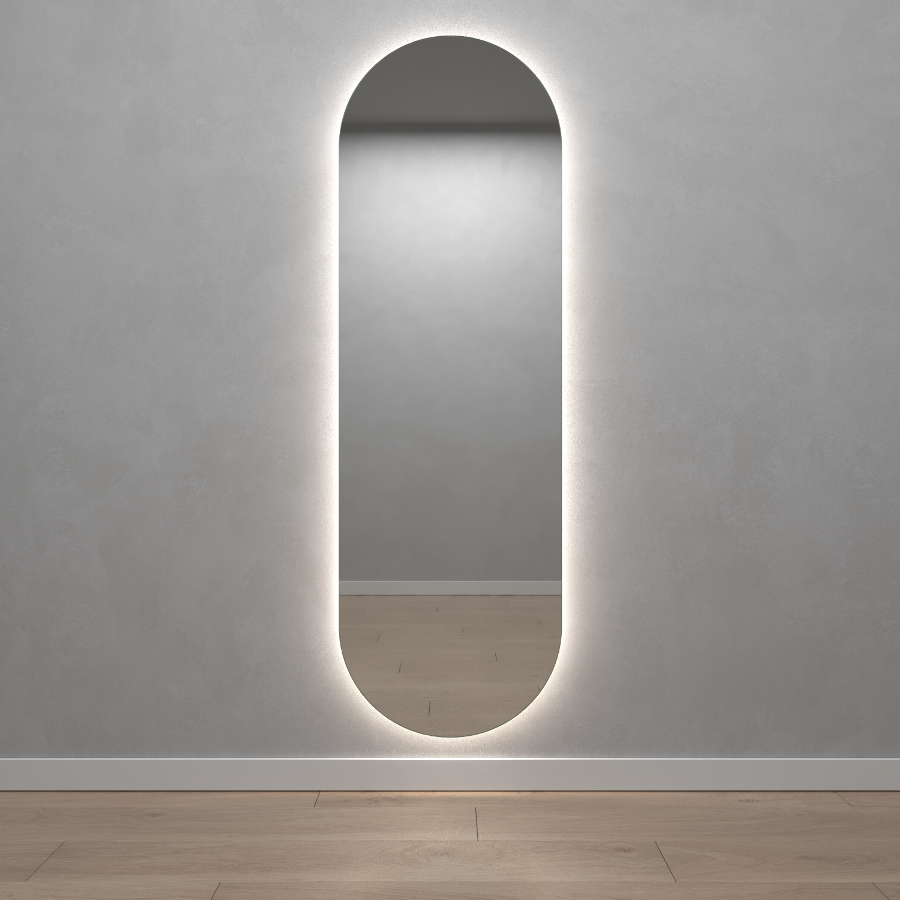 Безрамное зеркало овальной (капсульной) формы с контурной (тыльной) нейтральной подсветкой, свет 4000К. Подложка из высококачественного МДФ, светодиодная лента защищена матовым свето-рассеивателем от попадания пыли и влаги. Есть вывод 220W для подключения к сети, включение подсветки от выключателя на стене, либо от розетки. Возможно установить сенсорную кнопку на заказ в любом месте зеркала.