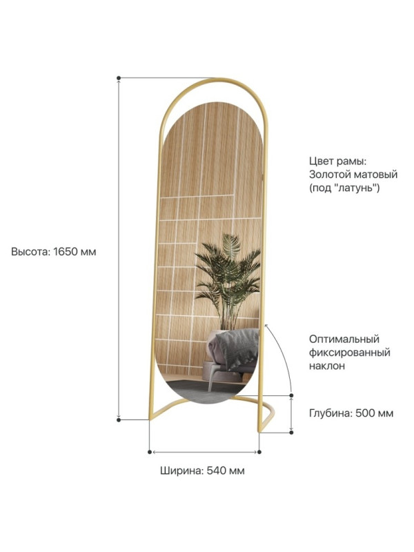 Зеркало «Queen». Артикул GMZ-01-1/2/3 Дизайнерское напольное зеркало в полный рост в металлической овальной раме ручной работы выполнено в минималистичном стиле. Простая изысканность форм и современный дизайн делает его уместным практически в любом интерьере. Оно может быть установлено в спальне, прихожей, гостиной, где за счёт своих внушительных размеров способно расширить пространство и создать иллюзию источника освещения. Зеркальное полотно изготовлено известным бельгийским производителем AGC и воплощает в себе старинные европейские традиции в совокупности с новейшими технологиями изготовления стекла. Наклон зеркала оптимальный фиксированный, что позволяет отражать любой рост.Характеристики:– профиль рамы – труба, диаметром 20 мм; – габариты – 1650х540х400 мм; – размер зеркального полотна – 1350х500 мм, толщина – 4 мм; – вес – 11 кг; – устойчивая двухслойная порошковая окраска; – возможные цвета – золотой, чёрный, белый.